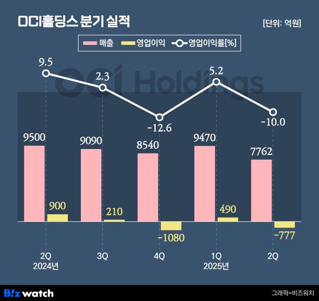 OCI홀딩스가 2분기 다시 적자로 돌아섰다. 미국의 정책 불확실성의 여파를 고스란히 받아내며 수익성이 크게 꺾였다.