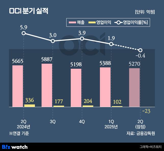 구체적으로 OCI 매출은 지난 1분기 5388억원에서 2분기 5270억원으로 7% 줄었고 이 기간동안 102억원이던 영업이익은 23억원의 영업손실로 기록, 적자 전환했다. 특히 OCI는 지난 2023년 5월 OCI홀딩스로부터 분할 된 이후 첫 분기 기준 적자를 기록했다.