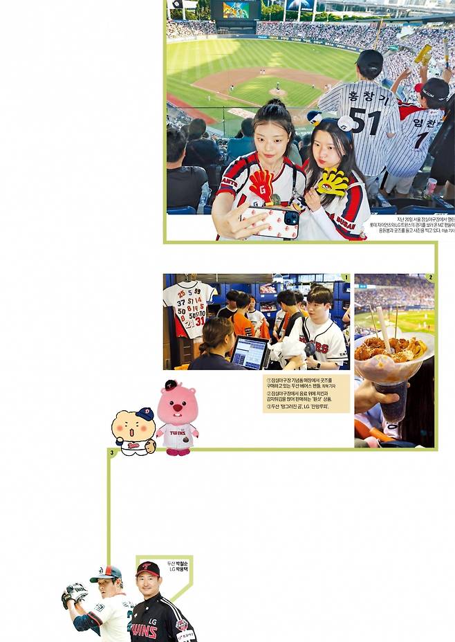 관중석 풍경도 크게 바뀌었다. 형형색색의 유니폼, 스페셜 에디션 굿즈, 선수 얼굴이 인쇄된 부채와 손팻말 등 개성이 넘치는 응원 아이템이 응원석에 가득하다. 과거에는 홈 유니폼과 원정 유니폼 등 두 가지 유니폼을 입은 관중이 주를 이뤘다면, MZ 팬은 유니폼을 통해 자신의 개성을 표현한다. 두산 베어스는 인기 캐릭터 ‘망그러진 곰’과, LG 트윈스는 ‘잔망루피’ 등과 협업한 상품을 내놓으며 MZ 팬의 취향을 정조준하고 있다.