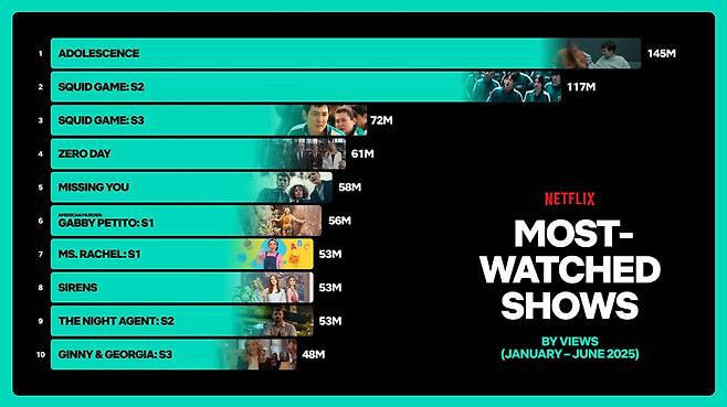 최근 넷플릭스는 여러 작품을 연이어 히트시키며 활약을 이어가고 있다. 특히 K 콘텐츠의 활약이 더욱 두드러지고 있는 상황. 넷플릭스가 지난 18일 공개한 '2025년 상반기 글로벌 시청 현황 보고서'에 따르면 다수의 K 콘텐츠가 이름을 올리고 있다.