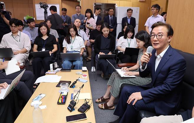 | ▲ 전재수 해양수산부 장관이 24일 정부세종청사 해수부 기자실을 방문, 기자들의 질문에 답하고 있다. 2025.7.24 |