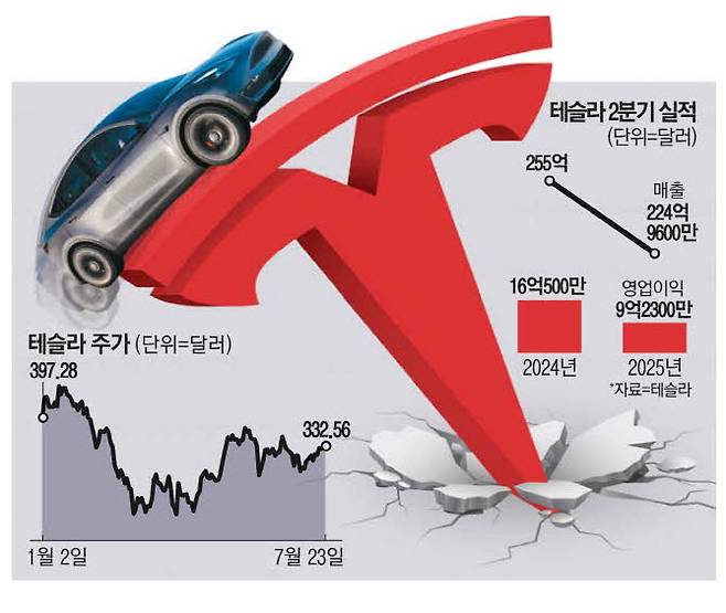 테슬라는 23일(현지시간) 2분기 실적 발표에서 매출 224억9600만달러(약 30조7900억원)를 기록했다고 밝혔다. 이는 전년 동기 대비 12% 줄어든 수치로, 테슬라 역사상 10년 만에 가장 큰 매출 감소폭이다. 영업이익은 42% 급감한 9억2300만달러(약 1조2600억원)였으며, 주당순이익(EPS)은 0.40달러로 1년 전보다 23% 감소했다. 테슬라 주가는 이날 정규장에서 전일 대비 0.14% 오른 332.56달러에 마감했으나 실적 발표 직후 시간 외 거래에서 4.4% 넘게 하락했다. 이날 종가 기준 테슬라는 올해 들어 17.65% 하락했다.