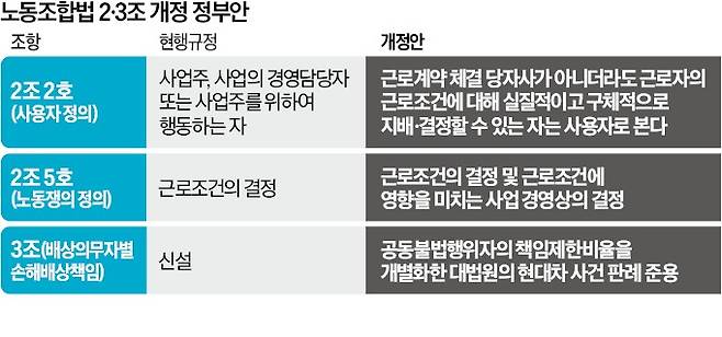 고용노동부가 최근 국회 환경노동위원회 의원들에게 설명한 ‘노동조합법 2·3조 개정 정부안’에는 경영계가 우려한 독소 조항이 모두 포함됐다. 국내 산업 생태계의 붕괴를 초래할 것으로 우려되는 제2조 2호(사용자 정의 확대)와 불법 파업을 조장할 것이란 지적을 받는 제3조(불법 쟁의 손해배상 책임 제한)가 대표적이다. 여기에 구조조정 등 경영상 의사 결정도 사실상 노조 허락을 받도록 하는 제2조 5호(노동쟁의 정의 확대)까지 들어가자 경영계는 “최악의 결과”라며 강하게 반발하고 있다.