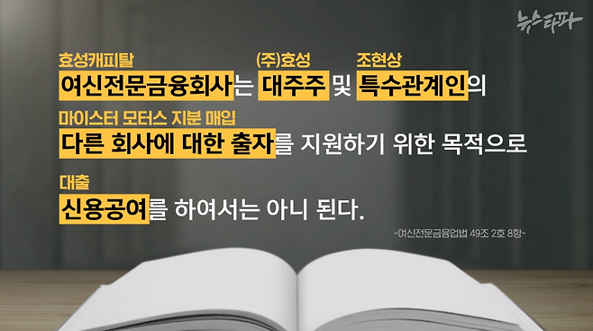 이 법조항에 따르면 2007년 조현상 부회장이 마이스터스모터스 지분을 차명으로 사들일 때 실행된 대출은 불법이다. 조현상은 (주)효성의 특수 관계인이었고 다른 회사, 즉 마이스터스모터스에 대한 출자를 목적으로 대출을 받았기 때문이다.