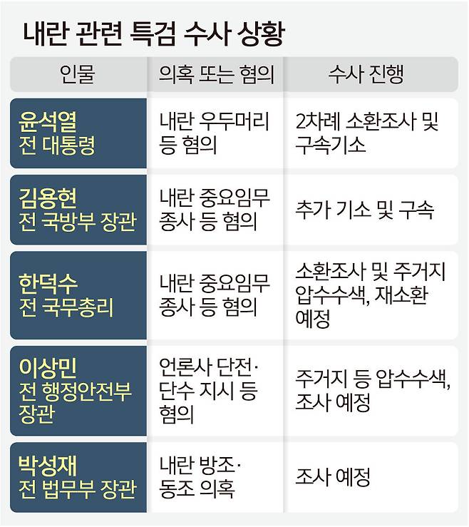특검은 계엄 선포 이후 언론사 단전·단수 지시 의혹을 받는 이상민 전 행정안전부 장관, 계엄 해제 당일 삼청동 대통령 안가에서 이 전 장관, 김주현 전 대통령실 민정수석 등과 회동한 박성재 법무부 장관에 대해서도 수사를 이어가고 있다. 특검은 17일 이 전 장관 주거지 등을 압수수색했고 25일엔 첫 소환조사를 한다.