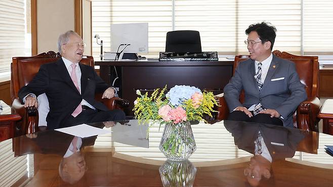 ▲ 김영훈 고용노동부 장관(오른쪽)이 24일 한국경영자총협회를 방문해 손경식 경총 회장과 대화하고 있다.