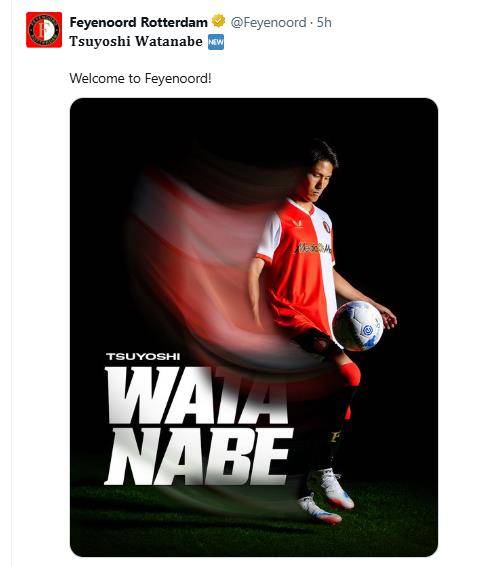 24일(한국시간) 구단은 공식 채널을 통해 벨기에 헨트 소속이었던 와타나베와 2029년 6월까지 계약을 맺었다고 발표했다. 이로써 황인범, 우에다 아야세에 이어 페예노르트에는 세 명의 아시아 선수가 함께하게 됐다.