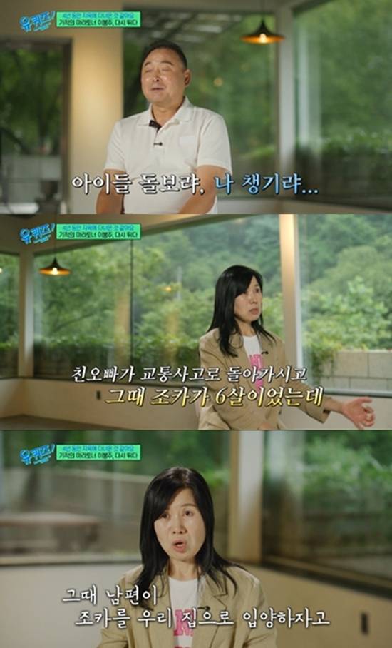 그의 아내는 "오빠가 교통사고로 돌아가시고, 그 아이가 그때 6살이었는데 남편이 아이를 우리 집에서 데리고 키우자고 하더라. 그게 사실 쉬운 게 아니다. 그 제안을 남편이 했고, 자기 조카한테 너무너무 잘해줬다. 아들이었다"고 입양하게 된 배경을 밝혔다.