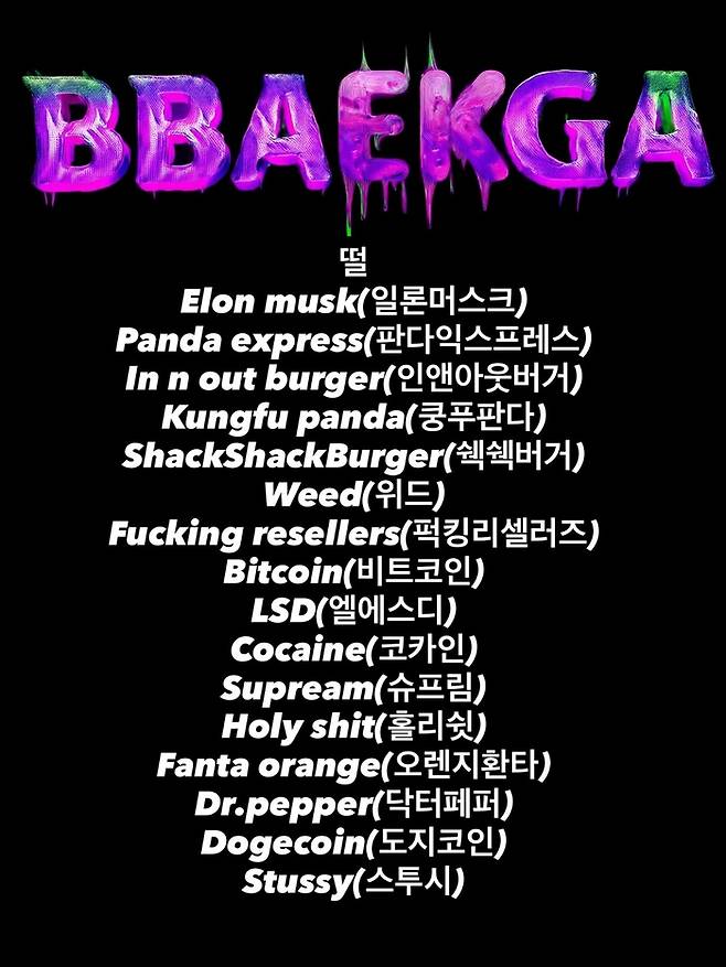 공개된 이미지에는 ‘Elon musk(일론머스크)’, ‘Panda express(판다익스프레스)’, ‘In n out burger(인앤아웃버거)’, ‘Kungfu panda(쿵푸판다)’, ‘Weed(위드)’, ‘Cocaine(코카인)’, ‘Bitcoin(비트코인)’, ‘Holy shit(홀리쉿)’, ‘Supream(슈프림)’ 등 다양한 브랜드명과 비속어, 약물·암호화폐 관련 단어들이 영어와 한글로 적혀 있다.