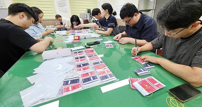 전면에 금액 표시가 없는 카드의 경우 후면 고유 번호 16자리 등을 공무원들이 스티커 위에 일일이 펜으로 적으면서 본래 분홍색 카드와는 확연한 차이를 드러냈다.