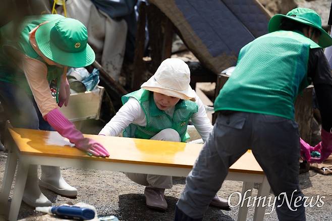 | ▲ 이재명 대통령 부인 김혜경 여사가 24일 오전 수해가 발생한 경기도 가평군 백둔리를 찾아 자원봉사 활동을 벌였다. |