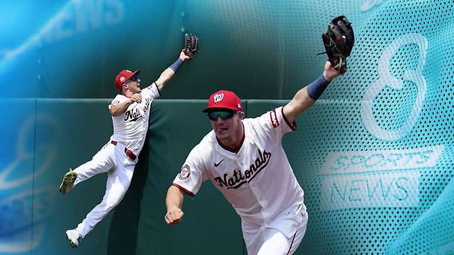 담장 위로 날아올라 홈런을 지워버린, 메이저리그 워싱턴 제이콥 영의 슈퍼 캐치 보시죠.