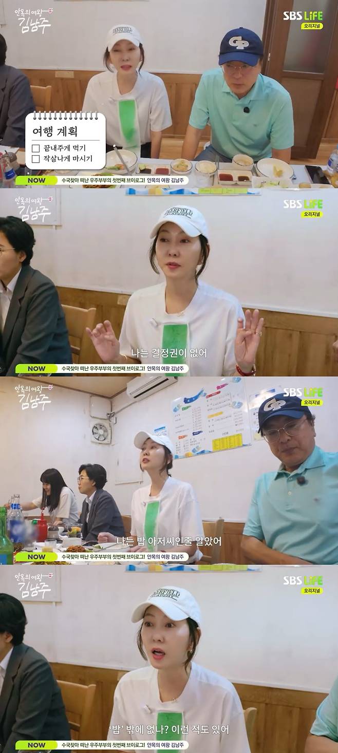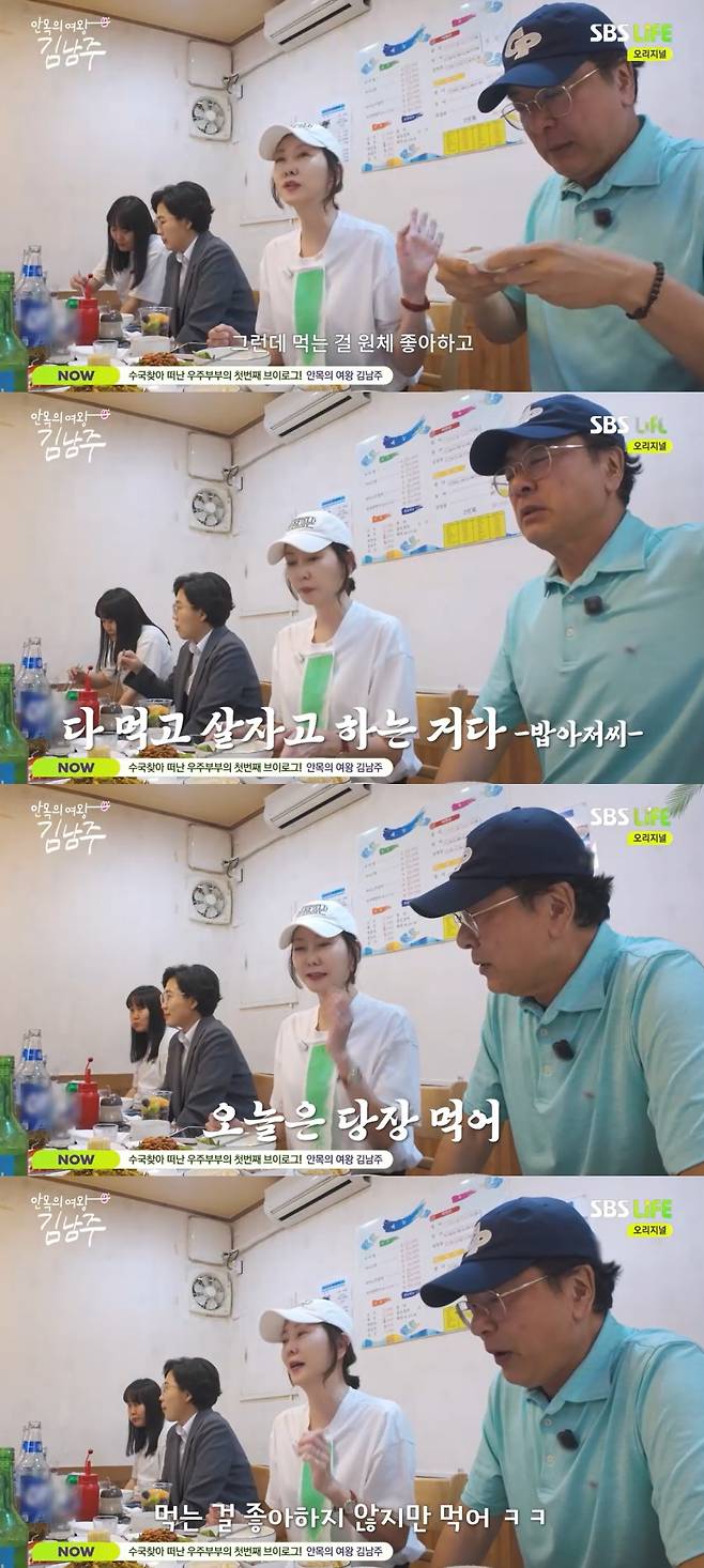 함께 식사를 하던 제작진은 두 사람에게 여행 가면 보통 무엇을 하냐고 물었고, 이에 김남주는 "이러고 있다. 먹고 마신다"라고 밝혔다.
