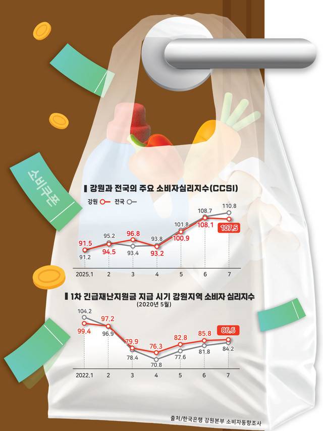 하지만 체감 경기 회복은 아직 더딘 분위기다. 한국은행 강원본부가 발표한 2025년 7월 강원지역 소비자심리지수(CCSI)는 107.5로 전월보다 0.6p 하락했다.