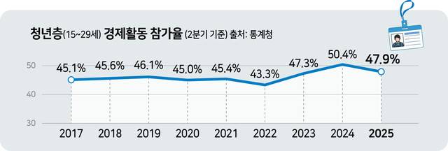2분기 기준 도내 청년층 경제활동 참가율은 지난 2017년 45.1%에서 꾸준히 오르다 2020년 코로나19 시기가 겹치며 감소 전환했다. 2023년부터는 다시 오름세를 보였으나 올해 2분기 47.9%로 하락했다.