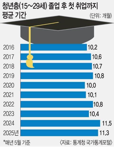 통계청이 24일 발표한 ‘2025년 5월 경제활동인구조사 청년층 부가조사 결과’에 따르면 올해 5월 청년이 졸업 후 첫 일자리가 임금근로자일 경우 첫 취업까지 평균 소요시간은 지난해 같은 달보다 0.2개월 감소한 11.3개월이다. 이 중 대졸 이상으로 범위를 한정하면 0.5개월 증가한 8.8개월로 2006년 해당 통계 작성 이래 최장기간이었다. 고졸 이하 청년은 1.1개월 감소한 1년 4.5개월이었다.