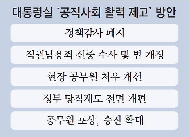 강훈식 대통령비서실장은 회의 직후 ‘공직사회 활력제고’ 브리핑을 열고 정책감사 폐지, 직권남용죄 신중 수사, 현장 공무원 처우 개선, 당직제도 전면 개편, 포상 확대 등을 100일 이내에 개선하겠다고 발표했다.