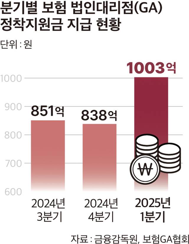 금감원은 설계사들이 이처럼 부당승환 계약을 유도하는 배경에는 보험업계의 과도한 정착지원금이 있다고 설명한다. 정착지원금은 GA가 설계사 유치를 위해 지급하는 돈으로, 올해 1분기 정착지원금은 1003억원에 달했다. 이는 이전 분기 대비 165억원(19.7%) 급증한 규모다. 관련 내부 통제를 위해 업계 자율 ‘정착지원금 운영 모범규준’이 마련된 이후인 지난해 4분기에는 838억원까지 감소했다가 다시 반등했다.