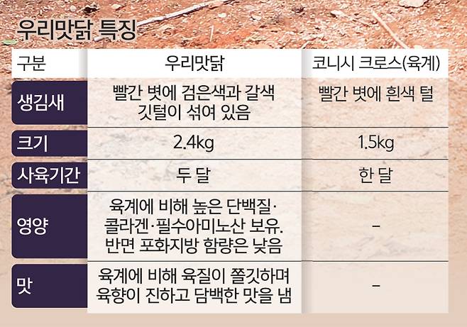 ‘우리맛닭’은 농촌진흥청이 맛 좋은 계통과 성장이 빠른 계통, 알을 잘 낳는 계통을 선별 교배해 2014년에 개발한 토종닭 브랜드다. 새빨간 벼슬에 검은색과 갈색 깃털이 섞여 있으며 육계보다 몸집이 큰 것이 특징이다. 특히 기존 토종닭의 장점인 고기의 깊은 풍미는 살리고 느린 성장 속도와 질긴 육질, 두꺼운 껍질 등은 개선됐다. 이처럼 토종닭보다 부드러운 육질 덕에 고령층, 어린이 등 다양한 소비 계층이 부담 없이 즐길 수 있다.