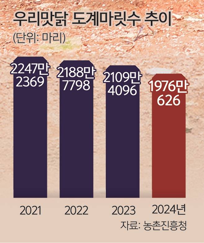 이 탓에 애써 개발한 우리맛닭의 도계(닭 도축) 마릿수는 꾸준히 줄어드는 추세다. 기존에 정부 주도로 이뤄지던 씨닭 분양을 민간 종계장 2곳(소래축산, 한협원종)으로 넘기는 등 정부가 우리맛닭 보급 확대를 위한 갖가지 노력을 하고 있음에도 2021년 2247만여마리던 우리맛닭 도계 마릿수는 꾸준히 줄어 지난해(1976만마리) 2000만마리 밑으로 떨어졌다. 이는 우리나라 전체 닭 도계 마릿수의 2% 수준에 불과한 규모다.