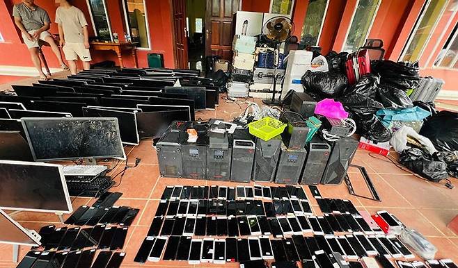 | ▲ 현지 경찰의 온라인 스캠 범죄 아지트 급습으로 압수된 컴퓨터와 휴대전화기들. |