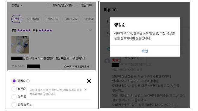 자체 알고리즘 정렬 방식은 리뷰 글자 수, 작성일, 평점(별점), 사진 포함 여부 등 온라인몰마다 기준이 달랐으나 대부분 평점이 높고 장점 위주로 묘사된 리뷰를 먼저 표시했습니다.
