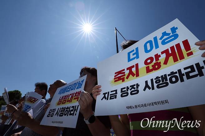 | ▲ 택배노동자 과로사 대책위원회 주최로 지난 11일 오전 서울 용산구 대통령실 앞에서 열린 '택배노동자 긴급 폭염대책 및 택배없는 날 시행 촉구 시민사회 공동 기자회견'에서 참석자들이 '택배노동자들에 대한 긴급 폭염 대책 마련'을 촉구하고 있다. |