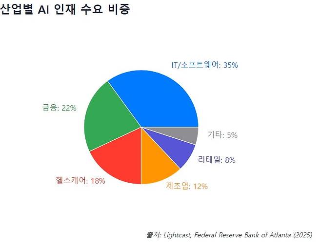 최근 AI가 전방위 산업으로 충격파를 주면서 AI 인재 부족 현상은 심화했다. 고용시장 분석기업 라이트캐스트의 올해 관련 보고서에 따르면 AI 기술 역량을 요구하는 일자리의 절반 이상이 IT 외 분야인 것으로 나타났다. 2022년 대비 생성형 AI 직무가 800% 급증했다. AI 기술 보유자는 동일 경력 대비 28% 높은 연봉을 받는 등 모든 산업에서 프리미엄이 붙고 있다는 분석도 나왔다.