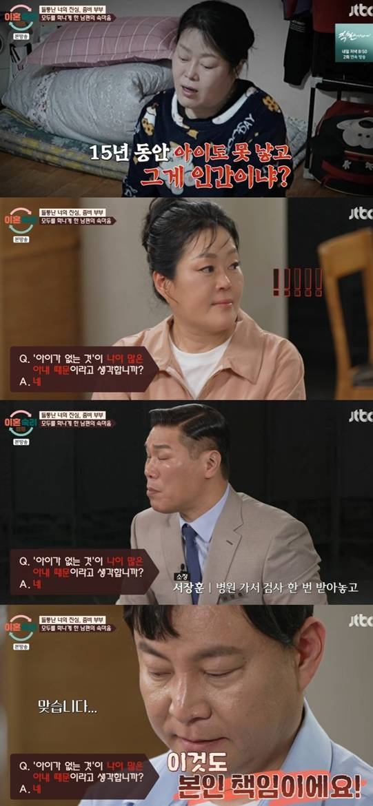 아내는 "이런 이야기를 들을 때마다 충격이었다"고 털어놨고, 서장훈은 "병원에서 검사 한 번 받고 안 된다고 이러는 게 말이 되냐. 꾸준히 받고 다니면 될 수 있는데 내가 그렇게 못해서 나때문이라고 생각해야지 상처 있는 사람한테 '너 때문이야' 이러면 얼마나 충격을 받겠나. 답답하다"며 분노했다.