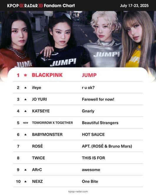 ‘케이팝레이더’ 위클리 팬덤 차트는 한 주간 어떤 아티스트가 많이 성장했는지를 보여주는 증감률 기반 차트다. 25일 발표된 이번 차트에서 블랙핑크는 디지털 싱글 ‘뛰어(JUMP)’로 지난주에 이어 또 한 번 정상에 올랐다.