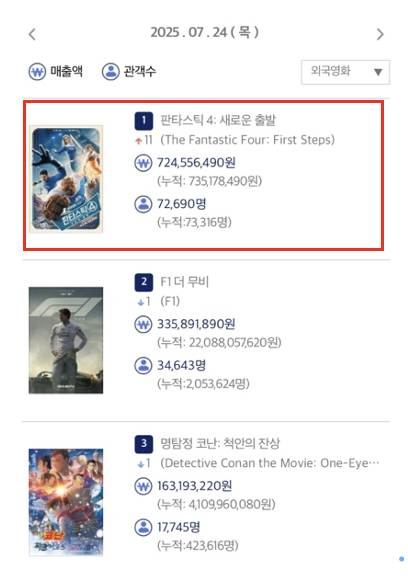 24일 개봉한 '판타스틱 4: 새로운 출발'은 영화관입장권 통합전산망 기준 72,690명의 관객을 동원하며 외화 박스오피스 1위를 차지했다.