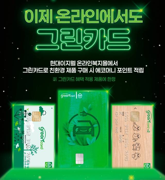 그린카드란 일상 생활 속에서 친환경 생활을 실천하는 소비자에게 에코머니 포인트 등 경제적 인센티브를 제공하는 친환경 소비 촉진 정책이다. 기존 오프라인 가맹점에서만 제공되던 인센티브 적립 서비스를 현대이지웰이 처음으로 온라인까지 확대해 선보이는 것으로, 그린카드 온라인 적립 서비스는 고객이 현대이지웰 온라인 복지몰에서 환경표지 인증제품·저탄소제품·친환경 인증 농산물 등 적립대상 상품을 그린카드(신용·체크카드)로 구매 시 구입액의 5~25%를 에코머니 포인트로 적립해 준다. 적립된 에코머니 포인트는 다양한 사용처에서 현금처럼 사용할 수 있다.