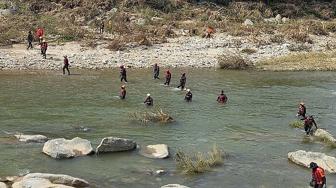 오늘(25일) 수색 작업에서 참가자들은 실종자가 발생한 마일리부터 청평 하류 지역까지 일대를 드론과 헬기, 구조견, 도보 인원 등을 동원해 실종자를 찾는 중입니다.