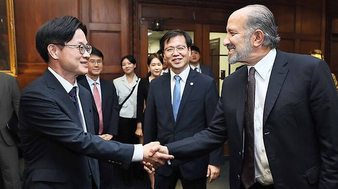 ▲ 김정관 산업통상자원부 장관은 24일(현지시간) 하워드 러트닉 미 상무부 장관과 악수하고 있다.