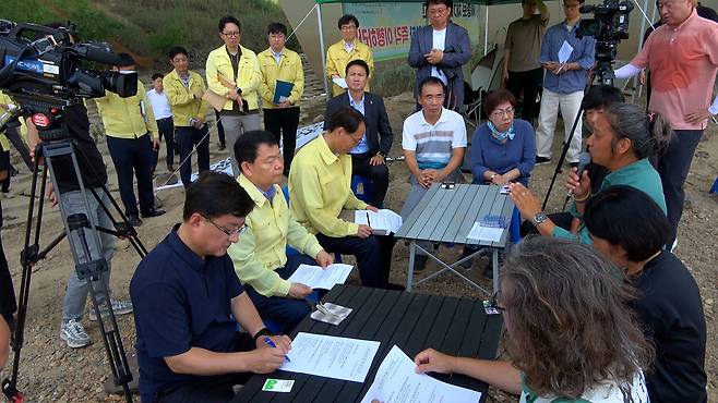 | ▲ 세종보 농성장을 찾은 김성환 환경부장관의 간담회 모습 |