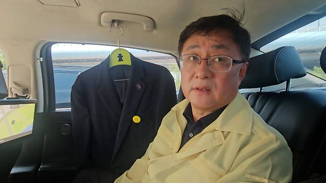 | ▲ 차량에 탑승해 <오마이뉴스>와 스팟인터뷰를 하고 있는 김성환 환경부장관 |