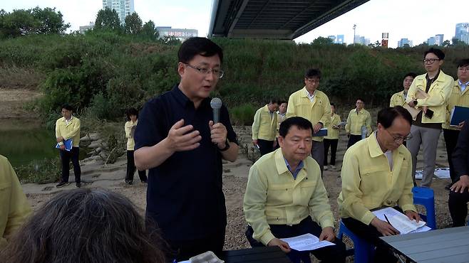 그 뒤에도 10분 동안 질의응답과 마무리 발언이 이어졌고, 김 장관은 환경단체 활동가들과 함께 "강물아 흘러라" 구호를 외치며 기념사진을 찍었다.
