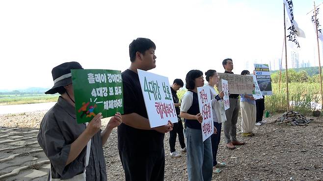 한편, 이날 '세종보 철거를 원하는 시민모임' 소속 시민들도 참석해 세종보 재가동 중단과 4대강 재자연화 촉구 피켓을 들고 간담회를 지켜봤다.