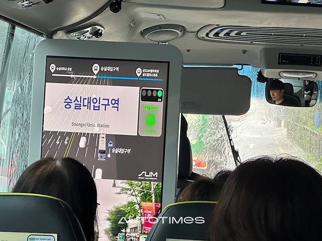 상단에는 운전석을 실시간으로 비추는 카메라 화면이 고정돼 있어 운전자가 실제로 조작하지 않고 있다는 점을 시각적으로 증명한다. 동시에 차 내에 배치된 디스플레이에는 동작구청의 구정 소식이나 공공 안내 콘텐츠가 재생되며 지역 밀착형 교통 서비스로서의 기능도 수행하고 있다.
