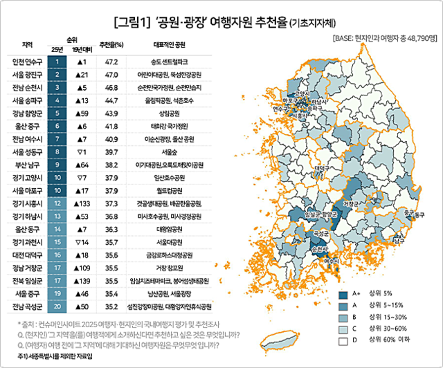 또 “공원·광장 여행 자원 평균 추천율은 여행자(27%)가 현지인(25%)보다 소폭 높았지만, 서울 송파구(4위)·성동구(8위)와 경남 함양(5위) 등 일부 지역은 현지인 추천이 20%포인트 이상 더 높게 나타난 예외적인 지역”이라고 말했다.