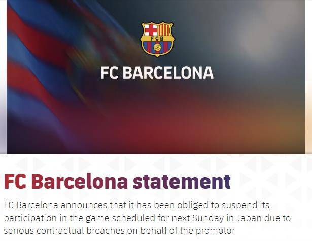 사유는 계약 위반이다. 바르셀로나는 '프로모터가 중대한 계약 위반을 저질렀다'고 했다. ESPN은 '계약 위반은 바르셀로나가 경기에 참여하는 대가로 주최 측이 약속한 금액과 관련이 있다'고 전했다.