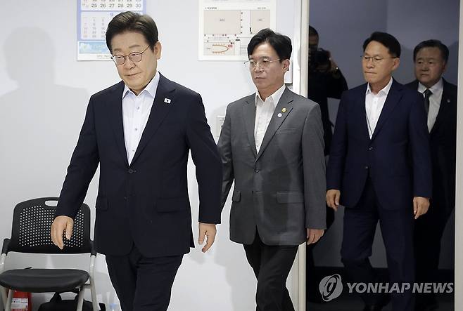 (시흥=연합뉴스) 홍해인 기자 = 이재명 대통령이 25일 경기 시흥시 SPC 삼립 시화공장에서 열린 산업재해 근절 현장 노사간담회에 입장하고 있다. 2025.7.25 [대통령실통신사진기자단]