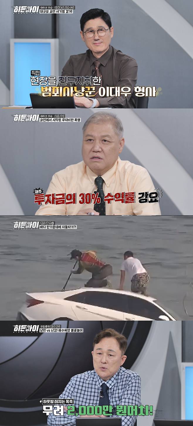 코인사기와 물속 차량의 전말, 하룻밤에 2천만 원이 넘는 비용이 소비되고 있다는 여름철 불법 행위의 실체는 28일 오후 7시 40분 '히든아이'에서 확인할 수 있다.