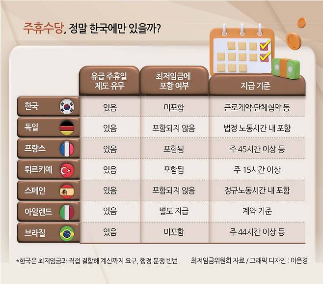 게다가 이들 국가의 제도 설계 방식은 한국과 다르다. 예를 들어 스페인은 유급휴일을 ‘정규 노동시간’에 포함시켜 임금 총액에 녹여낸다. 별도 계산이나 요건 없이 자연스럽게 반영되는 구조다. 반면 한국은 ‘주 15시간 이상’이라는 조건을 달고, 최저임금 산정 공식을 따로 둔다. 이처럼 ‘정형화된 설계’는 오히려 분쟁의 원인이 되고 있다는 지적도 있다.