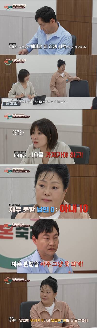 남편 측의 박민철 변호사는 "먼저 말씀을 드리면 채무(2천만 원)를 분할해야 하는 상황이다. 남편분이 이건 아내가 10을 가져가야 하고, 남편은 부담할 게 없다고 생각하셨다"고 해 조정장을 술렁이게 했다.