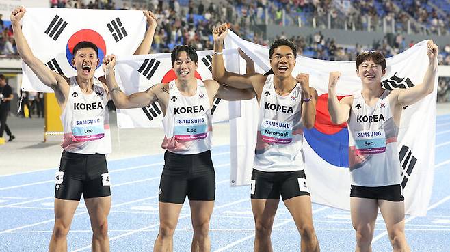 ▲ 지난 5월 '2025 구미 아시아육상선수권대회'에서 남자 계주 400m에 출전한 대표팀 선수들이 결선에서 1위로 들어온 뒤 기뻐하고 있다. 왼쪽부터 이준혁(국군체육부대), 이재성(광주시청), 나마디 조엘진(예천군청), 서민준(서천군청).