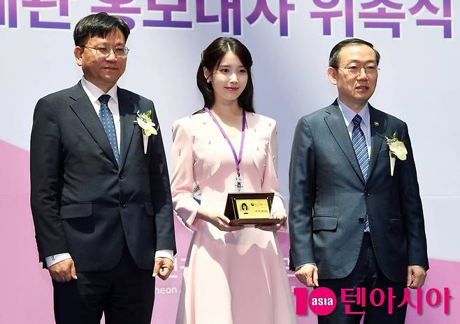 [텐아시아=조준원 기자]김종호 인천공항본부세관장, 아이유, 이명구 관세청장이 25일 인천 중구 운서동 인천국제공항에서 열린 인천공항본부세관 홍보대사 위촉식에 참석해 포즈를 취하고 있다.