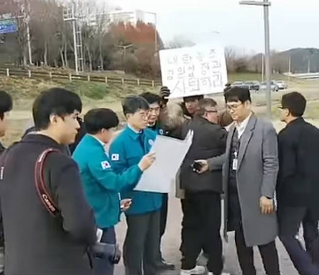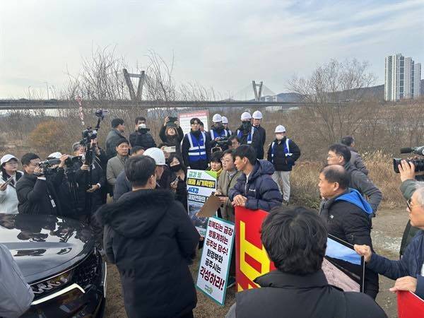 | ▲ 현장에서 설명을 듣는 김완섭 전 환경부 장관과 항의하는 활동가 |