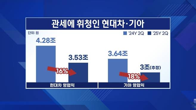 <앵커> 현대차와 기아의 2분기 영업이익이 두 자릿수 감소세를 보이며 자동차 관세에 직격탄을 맞았습니다.