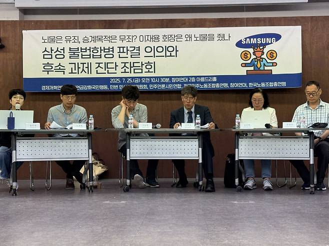 참여연대와 경제개혁연대, 민주언론시민연합 등 시민사회단체는 25일 오전 서울 종로구 참여연대 회의실에서 '삼성 불법합병 판결 의의와 후속과제 좌담회'를 통해 이같이 주장했다.